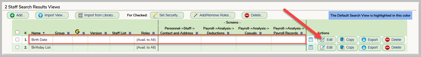 To integrate the Search Result View with your Search Contact and Address navigate to the Search Result View tab, select the Search Result View that you want to intergrade with the Search Contacts and Address tab and click on the Edit button. For this example, we will intergrade the Birthday list Search result view.