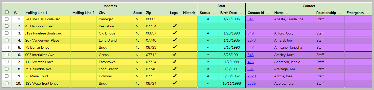 When you hit the Search button, you will have a custom report that lists the staff members Address(es) along with their birthdate information from the Search Result View. The Information highlighted in yellow is from the Search Contacts and Address tab, the information highlighted in Blue is from the Search Results View and the information highlighted in purple is from the Staff Contact database.
