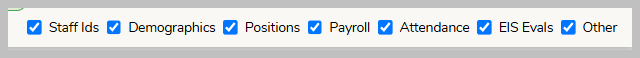 SchoolFi users can customize which sections of the Staff Search screen will display. Each section has a different colored background and the check boxed in the lower right-hand corner of the search parameters control which sections are visible.
