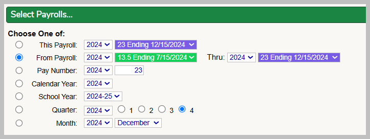 One of the unique search parameters is the payroll selector. By clicking on the Payrolls button, you can select the payrolls to be included in the custom report.