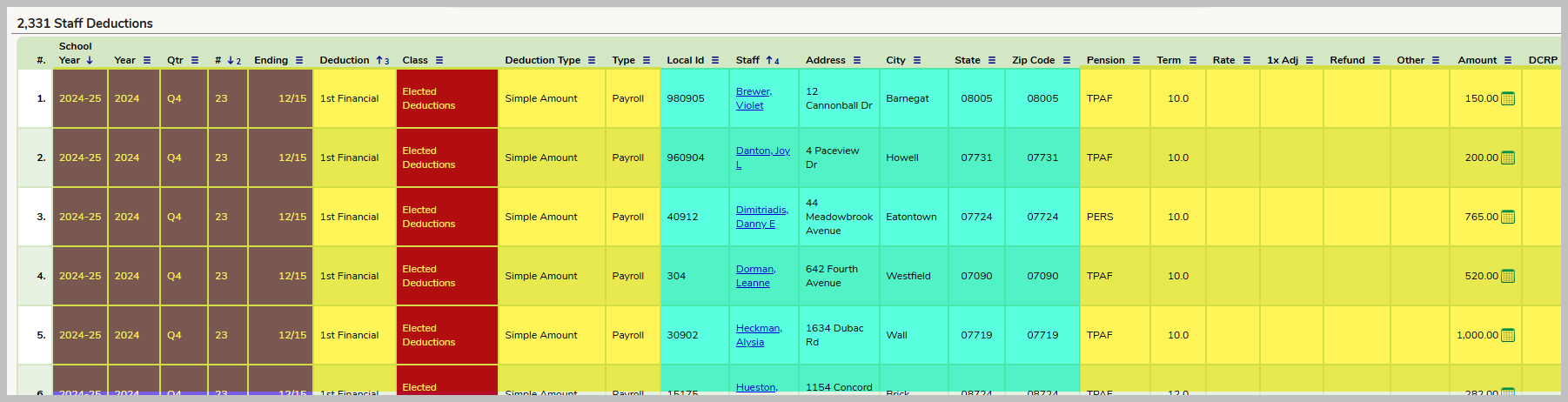 When you hit the Search button, you will have a custom report that lists the staff members Payroll Data along with the contact information from the Search Result View. The Information highlighted in yellow is from the Payroll Data and the information highlighted in Blue is from the Search Results View.