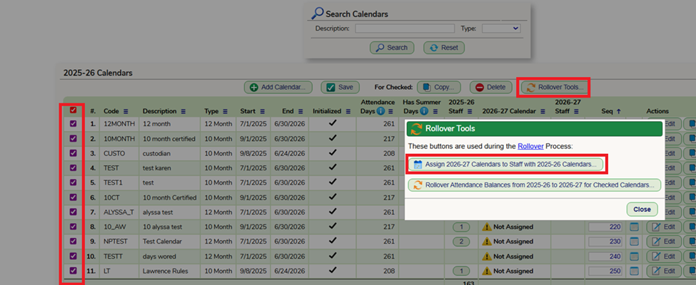 - Assign Staff to Next Year Calendars- Go to Set up – Calendars for the current school year. Highlight the calendars that were previously copied over and select the “Rollover Tools” button.- On the popup select “Assign ‘current school year’ Calendars to Staff with ‘next school year’ Calendars” button. - Depending on the size of your district this could take a few minutes.