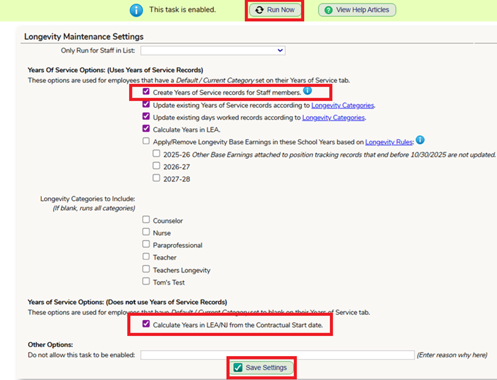 - Rollover Rules with Years in LEA- If you have rollover rules connected to the staff member’s Years in LEA, you must verify their current LEA is accurate and up to date. Prior to your scheduled rollover date, you will need to go to the System – Task screen. Search for “Longevity Maintenance”, click on the “Edit” button.- Enable “Create Years of Service records for Staff Members” and “Calculate Years in LEA/NJ from the Contractual Start date” boxes, save settings and run the task.
