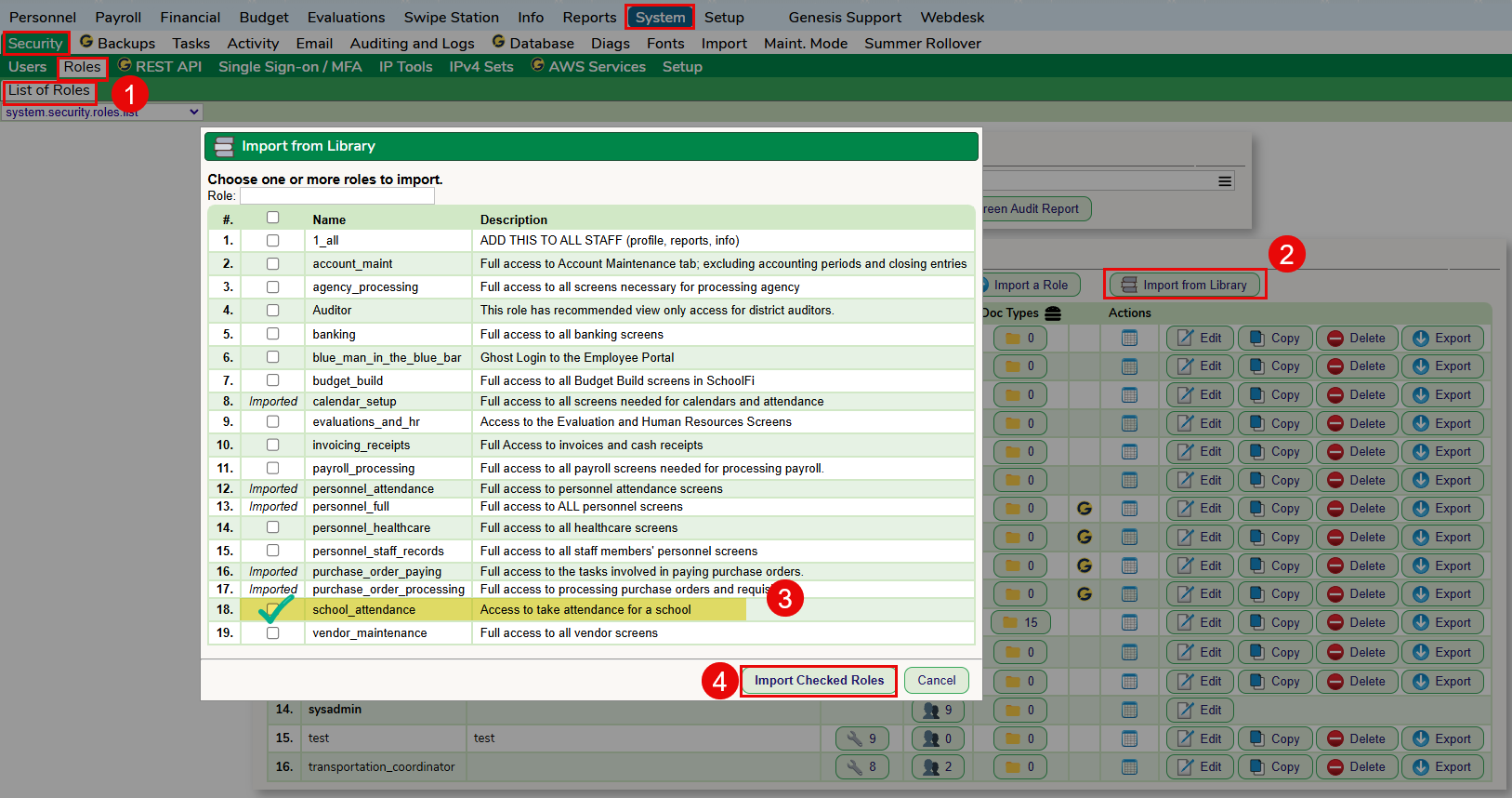 From the System > Security > Roles screen, click on the Import from Library button. Check off the school_attendance role and click the Import Checked Roles button.