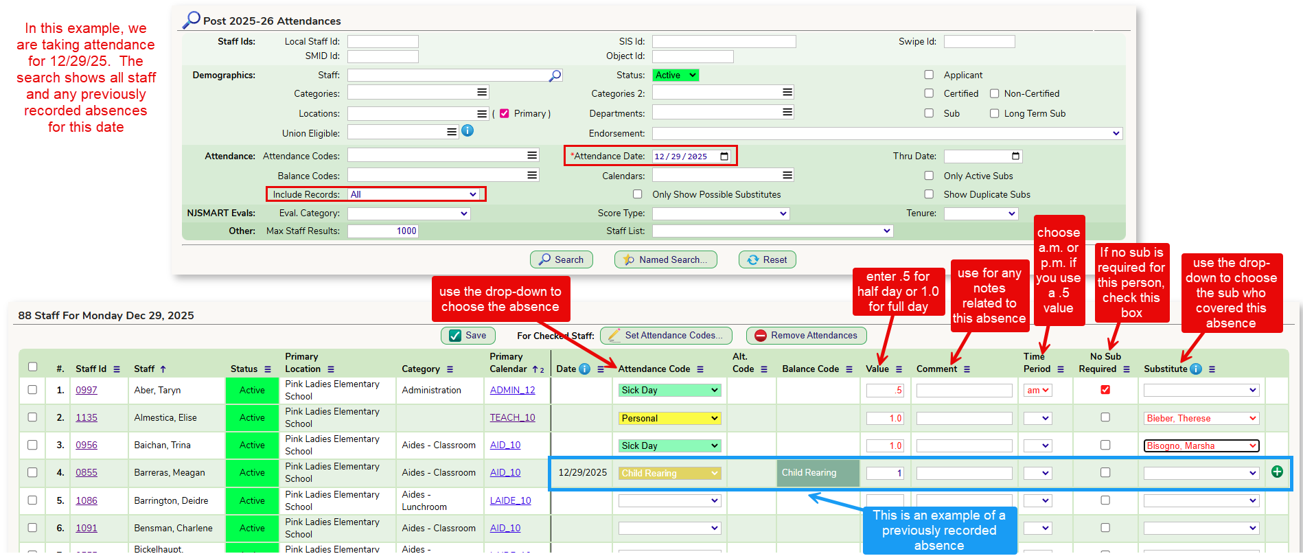 - change the "Include Records: field to All. This way you will see all attendance that was previously entered for the staff for the date(s) selected. This prevents you from duplicating attendance entries.