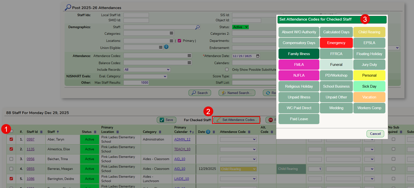 On the Personnel > Attendance > Post Attendance screen, you can use any of the search criteria in the search fields box to narrow the data down to your needs. You will only see the staff in the location in which you were assigned.