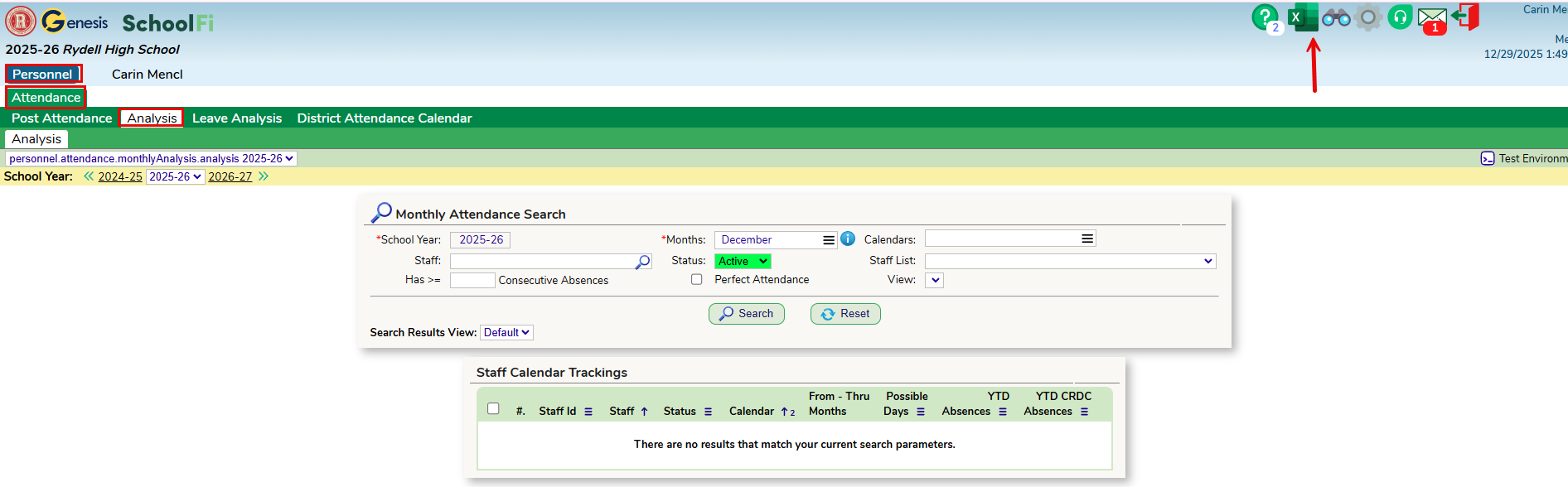 Using the Personnel > Attendance > Analysis screen gives you the ability to use the search criteria to populate data on attendance and export the search results to Excel using the icon at the top, right corner of the screen.