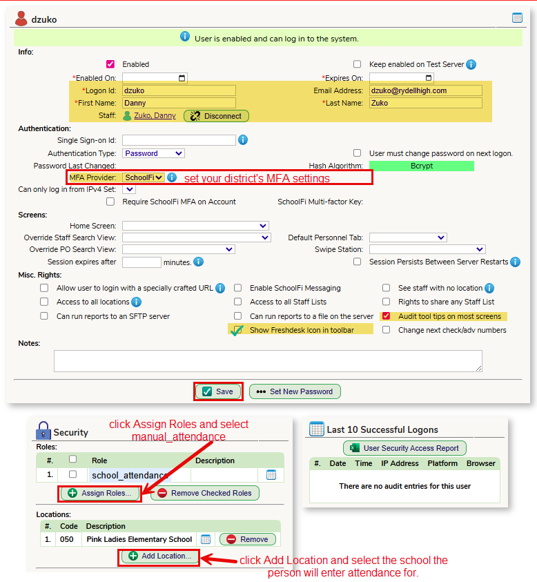 The following screen will open. Complete the highlighted areas. You should enter the Authentication Type and MFA Provider your district uses. Assign the school_attendance role you imported in step 1 and assign the school in which the staff member works.