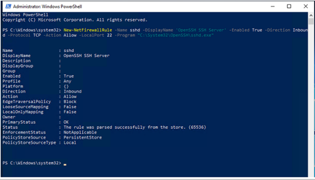 - New-NetFirewallRule -Name sshd -DisplayName 'OpenSSH SSH Server' -Enabled True -Direction Inbound -Protocol TCP -Action Allow -LocalPort 22 -Program " C:\Windows\System32\OpenSSH\sshd.exe"