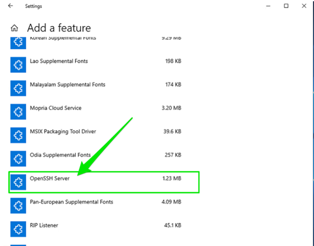 - Look for OpenSSH Server, check if it’s already installed, if not click on “Add a feature” to install it