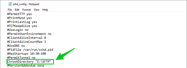 ChrootDirectory “E:\SFTPRoot” and save the file. You can change it to any Path you would like, but ChrootDirectory will lock the sftp user to that path.