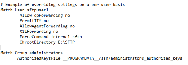 - Open configuration file sshd-config located in C:\ProgramData\ssh in Notepad. Add the following information at the bottom of the file in user settings: