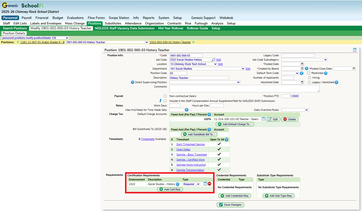 Within a Position Code, there is an option to add in Certification & Credential Requirements. This section is important if the district is running the CRDC Report from SchoolFi. All Position Codes that will be reported will need to be setup with Certifications that staff need to hold in order to hold that position.