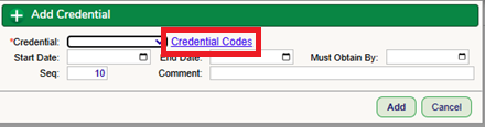 If you do not see the Credential you need in the dropdown, select the hyperlink. This will take you to the Codes table where you can enter in the Code and Description. Once you save and go back to the Credentials screen the new option will be listed.