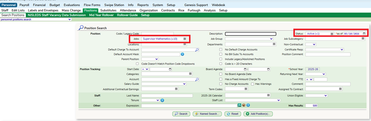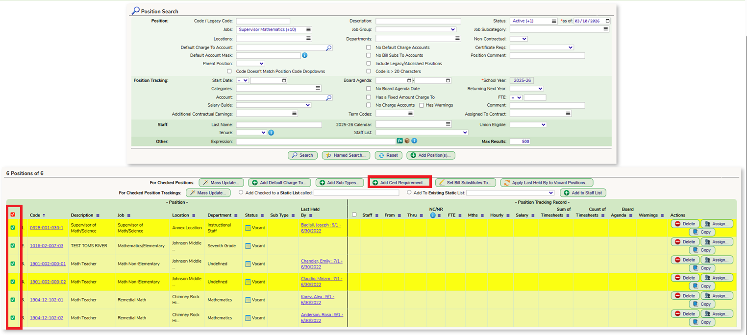 You can mass add Certifications to Positions on the Personnel - Positions screen. Run a search for a group of Positions. In this example I am pulling all Math Job Codes, making sure to include all active and vacant positions in my search.